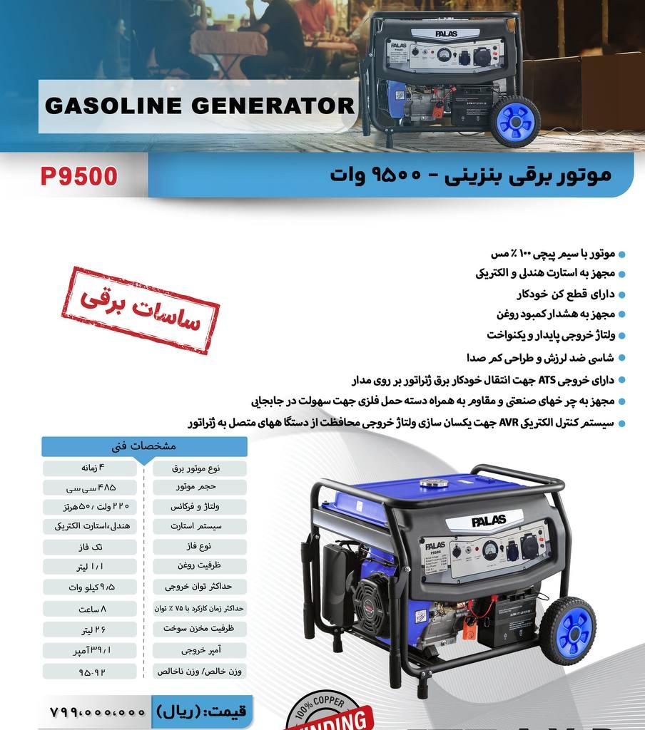 موتور برق ۹.۵ کیلووات بنزینی پالاس مدل P9500 ؛ غول بیرقیب توان و دوام (استارتی - تمام مس)